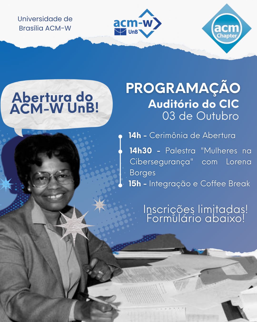 O Capítulo Estudantil da Association for Computer Machine-Women (ACM-W) na Universidade de Brasília (UnB) marca um passo histórico para a comunidade de tecnologia no país, sendo o primeiro capítulo da ACM-W fundado no Brasil (https://women.acm.org/new-acm-w-chapters-in-q2-q3-2025/). Vinculado à Association for Computing Machinery (ACM) — uma das maiores sociedades científicas e educacionais de computação do mundo. O capítulo tem como missão promover a participação de mulheres na computação e áreas correlatas, fortalecendo a presença feminina no cenário acadêmico, profissional e científico.