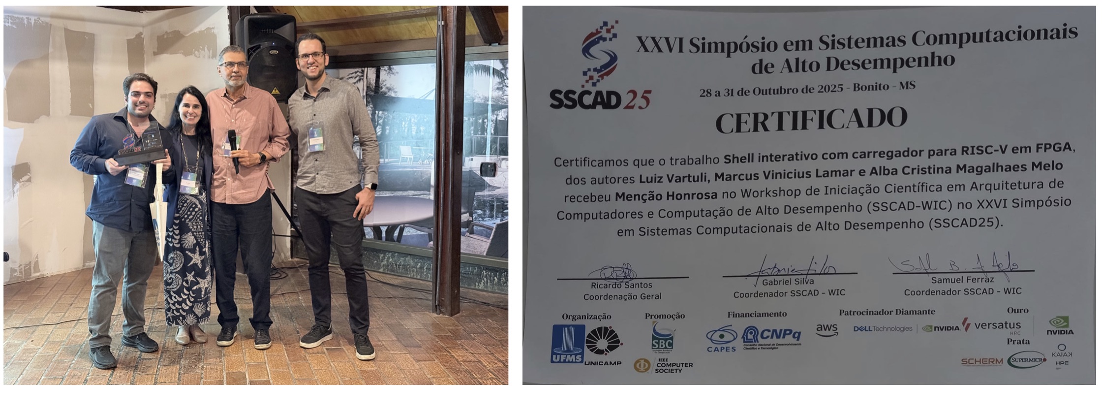 O artigo "Shell Interativo com Carregador RISC-V para FPGA", de Luiz Vartuli (Bacharelado em Ciência da Computação), Marcus Vinícius Lamar (CIC) e Alba Cristina M. A. Melo (CIC) ganhou menção honrosa no Workshop de Iniciação Científica (WIC) do Simpósio em Sistemas Computacionais de Alto Desempenho (SSCAD) 2025, realizado em Bonito, MS, de 28 a 31/10/2025. Parabéns, Luiz!!! Parabéns também ao orientador (Prof. Lamar) e à co-orientadora (Prof. Alba).